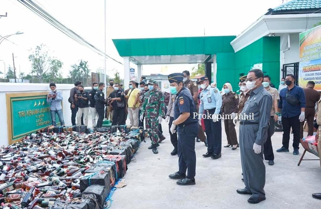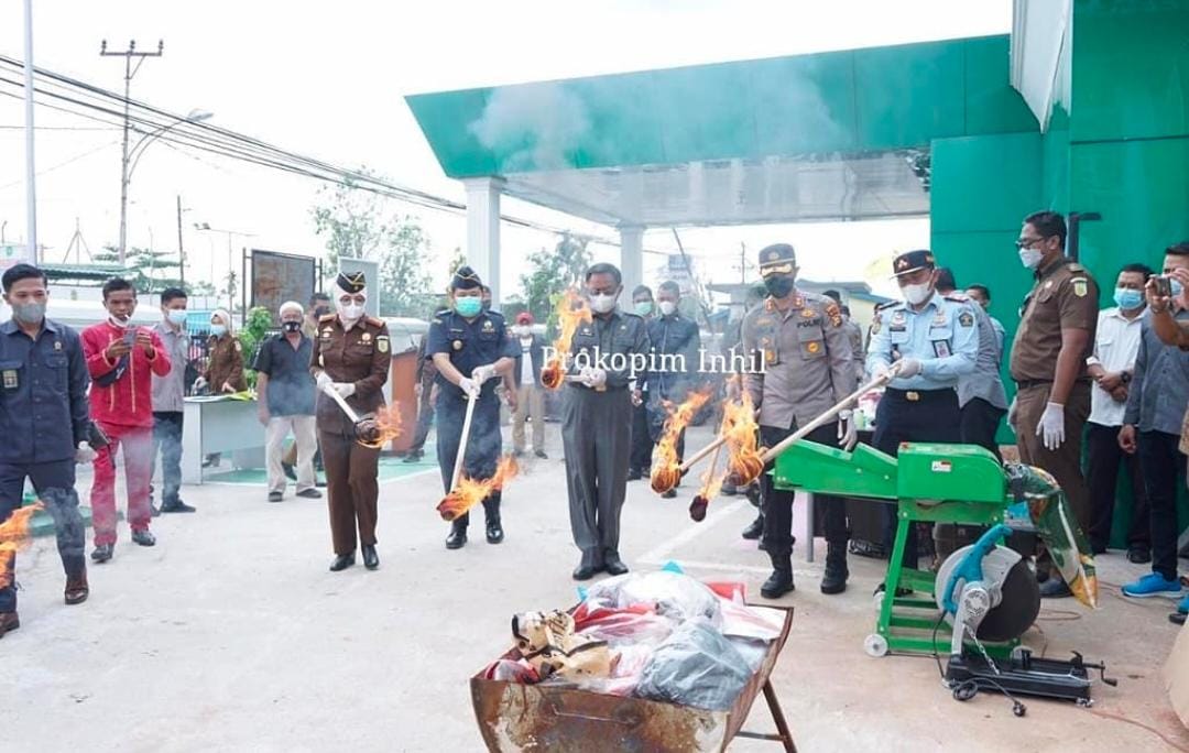 Acara diakhiri dengan pemusnahan barang bukti oleh Bupati beserta unsur Forkopimda dan penandatanganan berita acara pemusnahan barang bukti. (Galery/Diskominfoinhil)