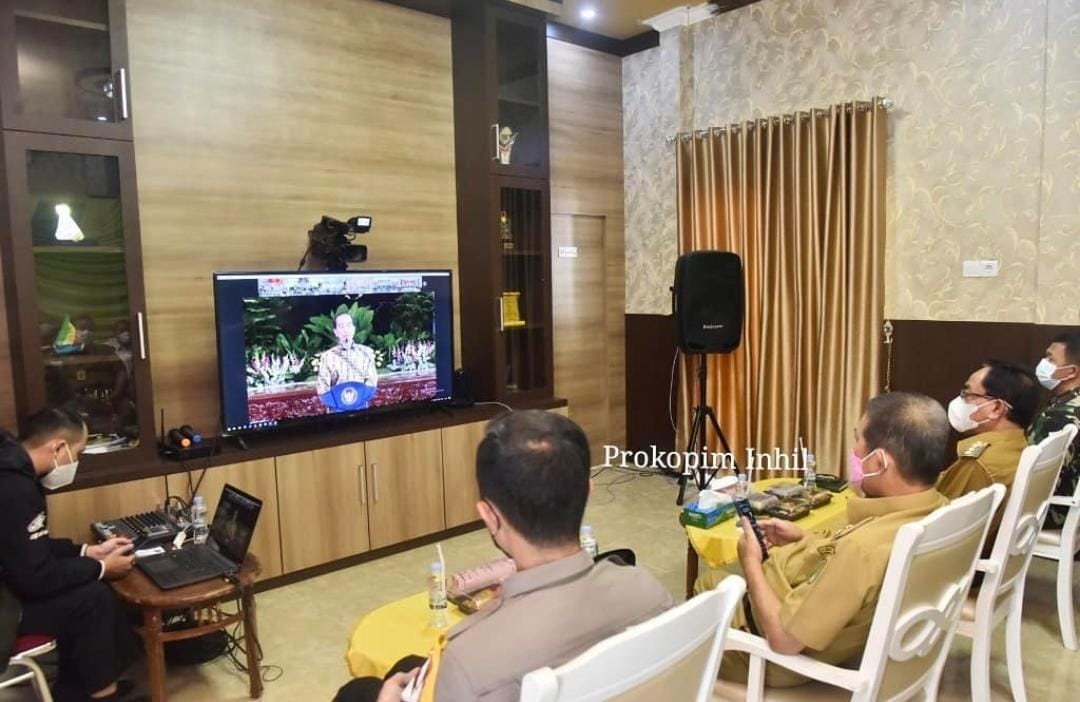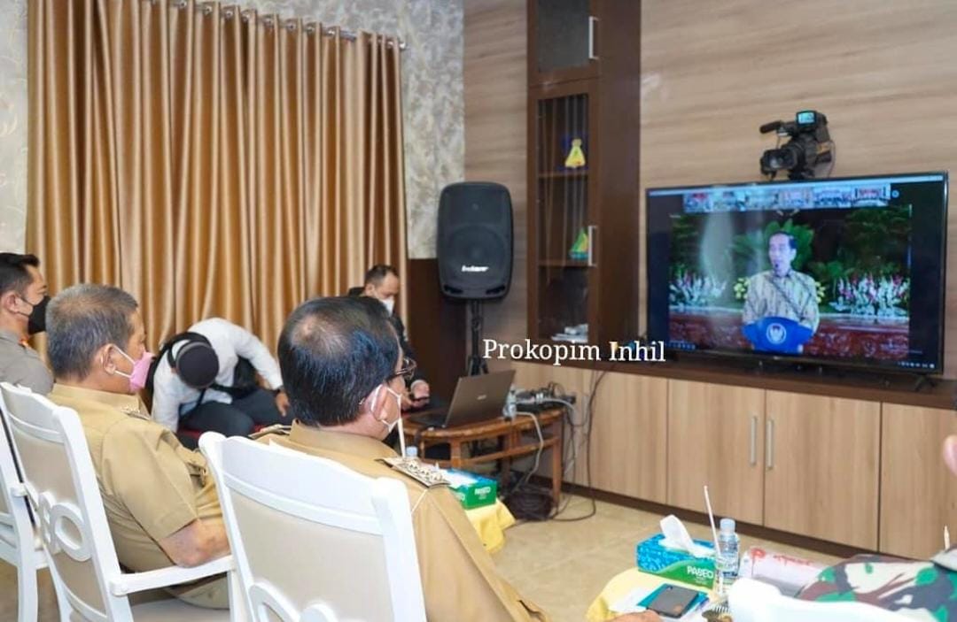 TRANSMEDIARIAU.COM - Bupati HM.Wardan bersama Wakil Bupati H.Syamsuddin Uti beserta Unsur Pimpinan Forkopimda Kabupaten Inhil turut juga dihadiri Sekda dan beberapa Pimpinan OPD terkait yang mengikuti rapat Penanggulangan Covid-19 melalui Video Confrence (Vid-Cov) bersama Presiden RI Ir.Jokowidodo yang didampingi Wakil Presiden RI serta para Menteri langsung dari ruang Multimedia Diskominfo Pers Inhil Kompleks Kantor Bupati Jl.Akasia No.1, Senin (17/5/2021) siang.
