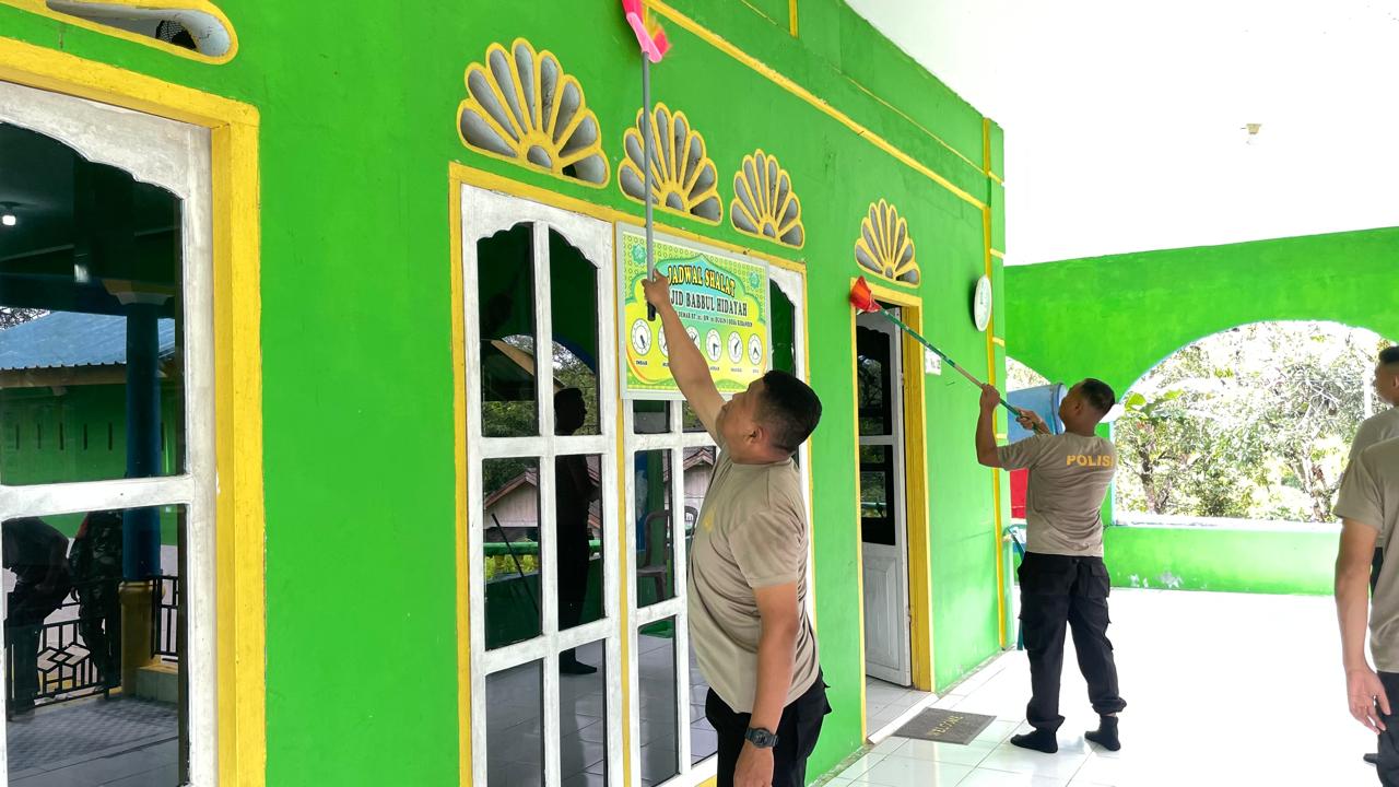 Sebagai bentuk nyata dukungan terhadap rumah ibadah dan kebersihan lingkungan, jajaran Polsek menyerahkan bantuan berupa cat tembok dan semen untuk mendukung renovasi ringan masjid. Tak berhenti sampai di situ, para personel juga terlibat langsung dalam aksi bersih-bersih menyeluruh mulai dari halaman, ruang utama salat, tempat wudhu, kamar mandi hingga jendela guna menciptakan suasana yang nyaman bagi jamaah.
