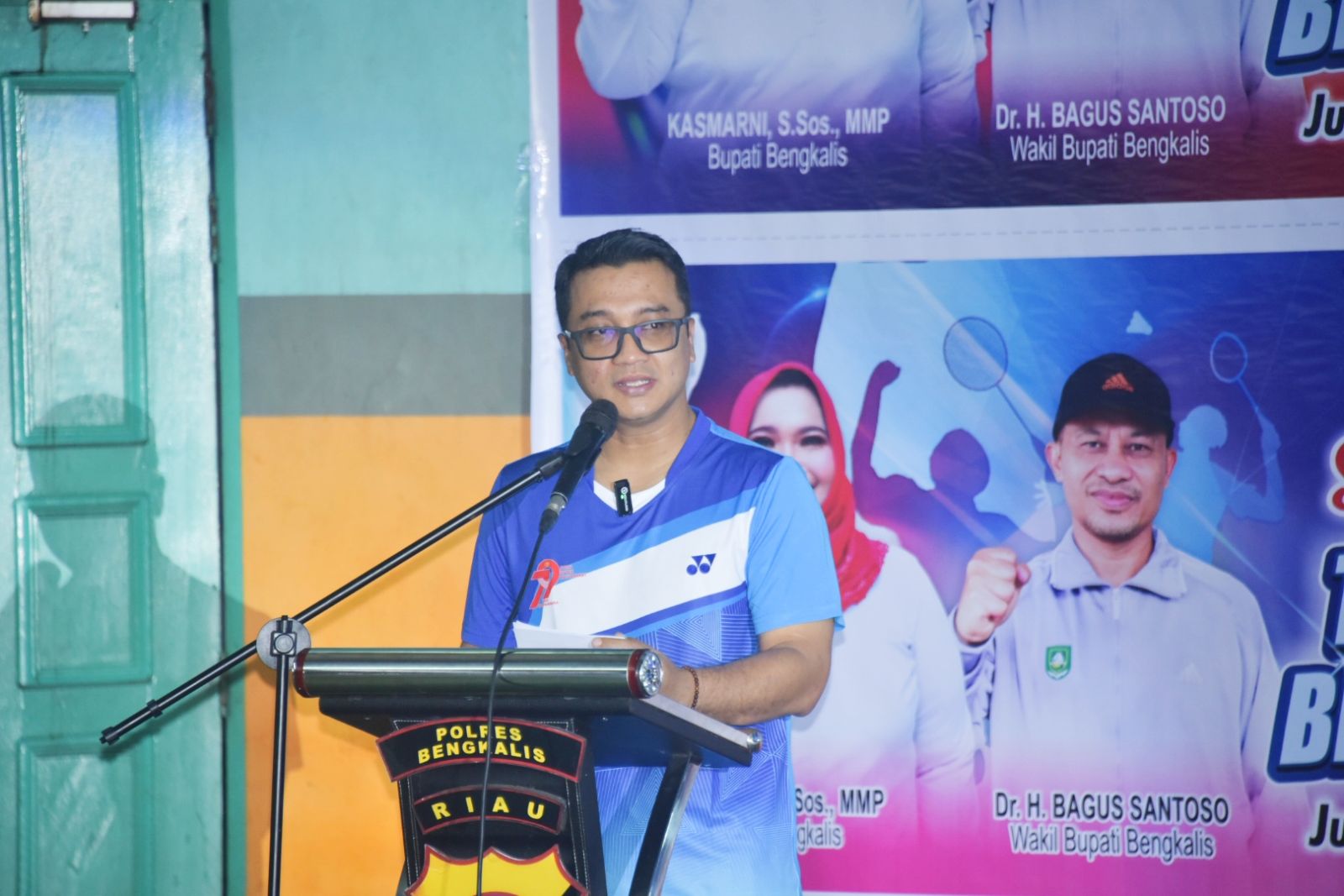 BENGKALIS, TRANSMEDIARIAU. COM- Bupati Bengkalis Kasmarni diwakili Staf Ahli Bupati Bidang Kemasyarakatan dan Sumberdaya Manusia Johansyah Syafri mengajak kepada seluruh peserta turnamen Badminton Bhayangkara Cup 2025, Polres Bengkalis menjunjung tinggi nilai-nilai sportivitas dan kebersamaan.
