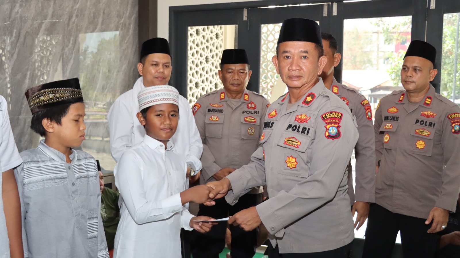 Sebagai bentuk kepedulian sosial, kegiatan ini juga diwarnai dengan pemberian santunan kepada 16 santri yatim dari Rumah Tahfidz Baitul Qur’an. Santunan diserahkan langsung oleh Kompol Andi Sutrisno, A.Md., S.H., M.H., Wakapolres Lingga, yang hadir mewakili AKBP Pahala Martua Nababan, S.H., S.I.K., M.H., Kapolres Lingga