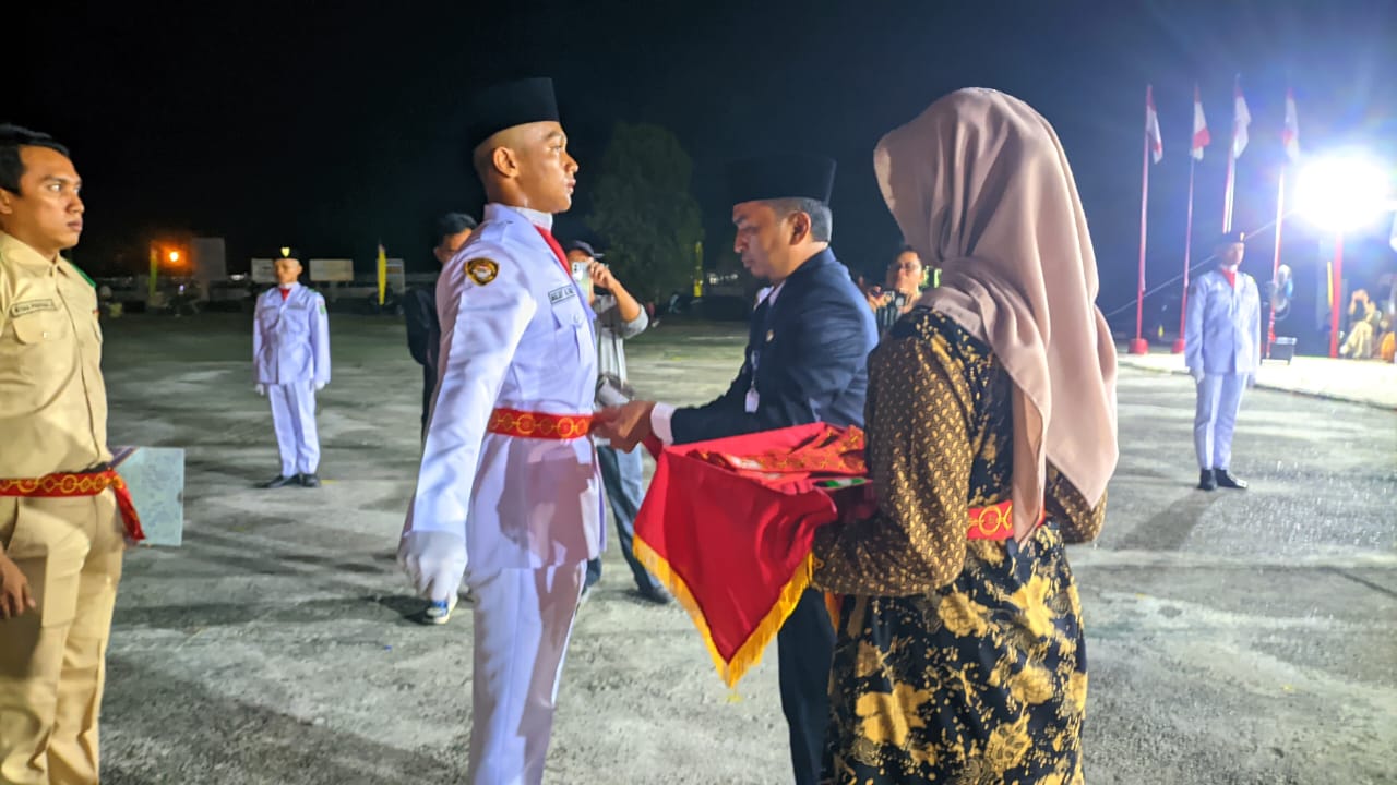 PINGGIR, TRANSMEDIARIAU. Com - Pegelaran Dirgahayu Hari Ulang Tahun Kemerdekaan Republik Indonesia ke-80 Tahun 2025, Camat Pinggir Zama Rico Dakanahay, S.Sos, M.Si., secara resmi mengukuhkan 16 orang Pasukan Pengibar Bendera Pusaka (Paskibraka) tingkat Kecamatan Pinggir Kabupaten Bengkalis, Sabtu (16/08/2025) malam.