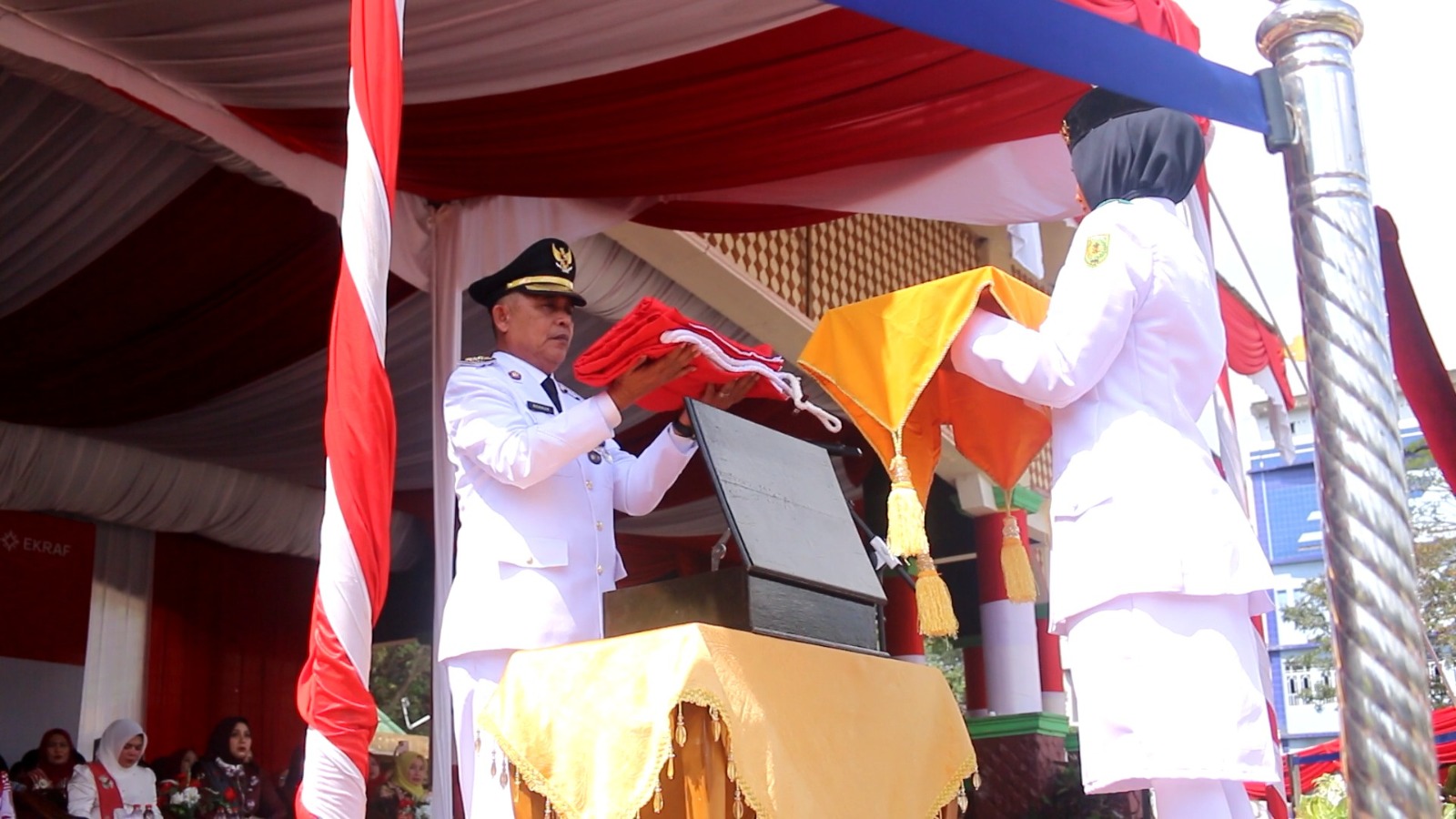 Rangkaian demi rangkaian acara dilangsungkan, mulai dari pembacaan Naskah Proklamasi oleh Ketua DPRD Iwan Taruna kemudian dilanjutkan mengheningkan cipta. Hingga saat yang dinantikan, prosesi khidmat pengibaran Sang Merah Putih oleh 32 anggota Paskibraka Inhil bersinergi dengan TNI/Polri.