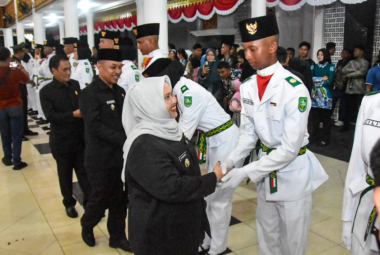 BENGKALIS,TRANSMEDIARIAU.COM – Bupati Bengkalis, Kasmarni, mengukuhkan Pasukan Pengibar Bendera Pusaka (Paskibraka) Kabupaten Bengkalis tahun 2025 di Balai Kerapatan Wisma Sri Mahkota, Jumat, 15 Agustus 2025.
