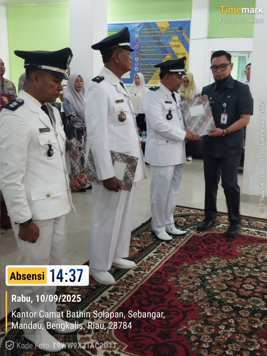BATHIN SOLAPAN, TRANSMEDIARIAU, COM - Bertempat di Aula Pertemuan Kantor Camat Bathin Solapan, Bupati Bengkalis yang diwakili Camat Batsol, M.Rusydy. M, S. STP, M.Si secara resmi melantik dan mengambil sumpah Penjabat (Pj) 3 orang Kepala Desa di wilayah Kecamatannya, Rabu (10/09).