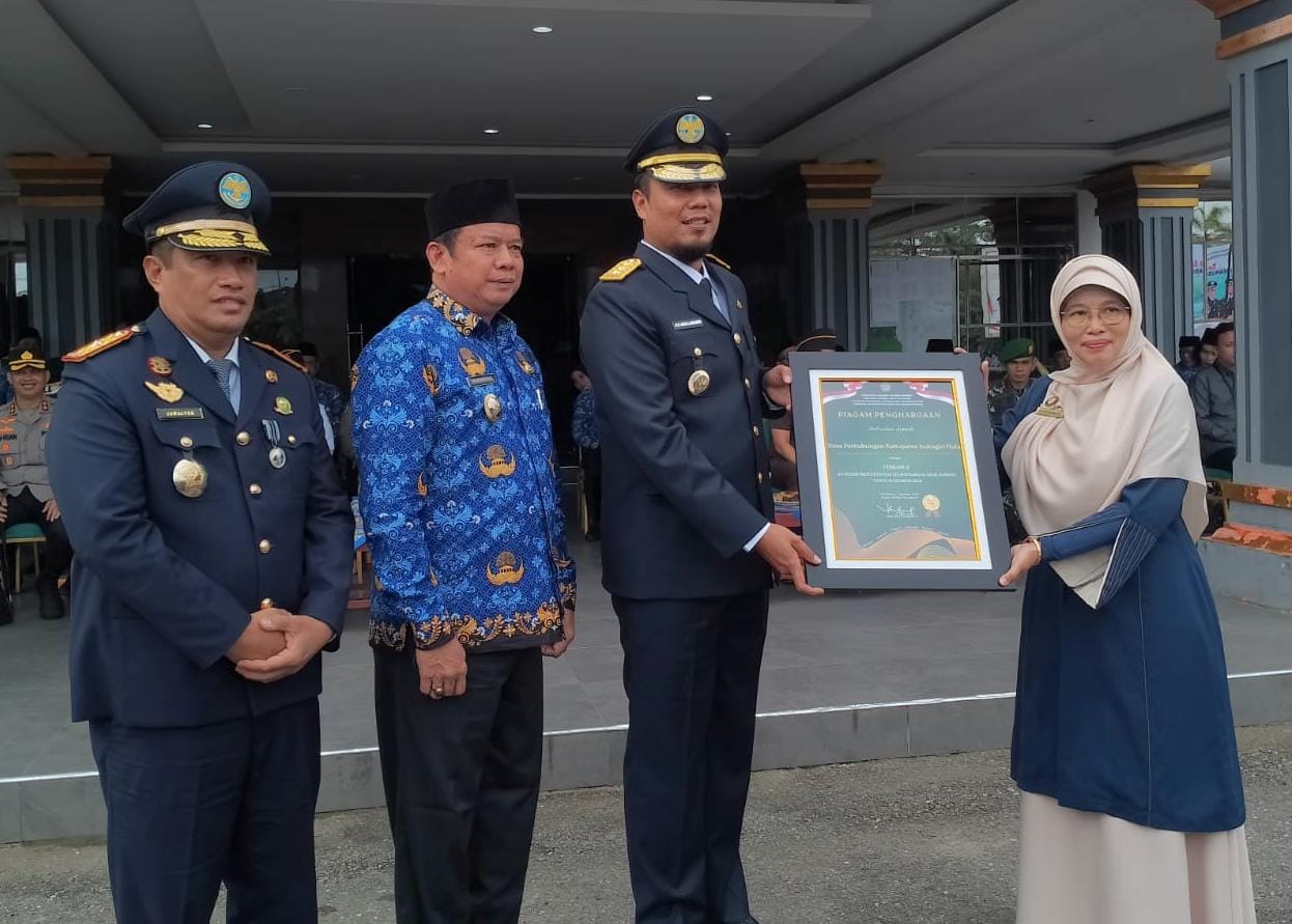 Usai upacara, Bupati Ade Agus Hartanto menerima piagam perhargaan dari Kantor Pelayanan Kekayaan Negara dan Lelang (KPKNL) Pekanbaru sebagai terbaik II kategori Produktivitas Lelang Barang Milik Daerah Tahun Anggaran 2024 kepada Dinas Perhubungan Inhu.