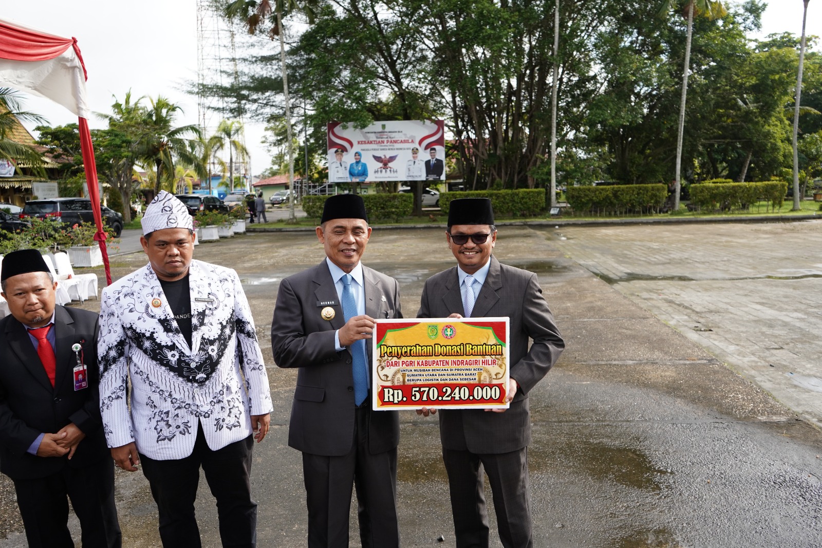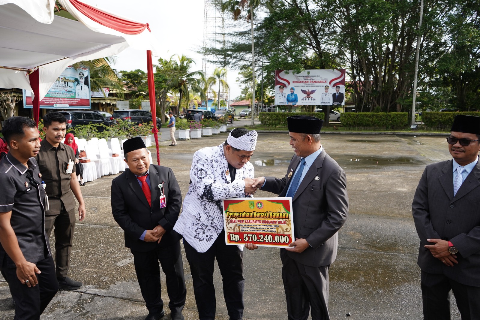 Sebagai wujud dukungan terhadap saudara sebangsa yang tengah diuji musibah bencana, usai upacara, dilangsungkan penyerahan bantuan untuk korban yang bersumber dari Dinas Pendidikan dan PGRI melalui penyaluran oleh BPBD Inhil.