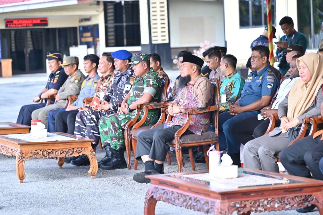Kegiatan ini turut dihadiri oleh unsur Forkopimda dan instansi terkait di Kabupaten Bengkalis, di antaranya Bupati Bengkalis yang diwakili oleh Asisten I Andris Wasono, AP., M.Si, Dandim 0303/Bengkalis yang diwakili Pasi Intel Kapten Inf Agus Dani, Ketua Pengadilan Negeri Bengkalis yang diwakili Hakim Mas Toha Wiku Aji, S.H., M.H, Danposal Bengkalis Lettu Laut Irwan PM Nirwan Hastya, Wakapolres Bengkalis Kompol Noak Pembina Aritonang, S.I.K, perwakilan Imigrasi Bengkalis, Kepala Bea Cukai Bengkalis Novriansyah, Kepala Disperindag Kabupaten Bengkalis Zulpan, ST, perwakilan Dinas Pariwisata, Kasat Pol PP Kabupaten Bengkalis Alfahrurrazy, Kalaksa BPBD Kabupaten Bengkalis Salman Alfarisi, S.T, serta para pejabat utama, perwira dan personel Polres Bengkalis.**