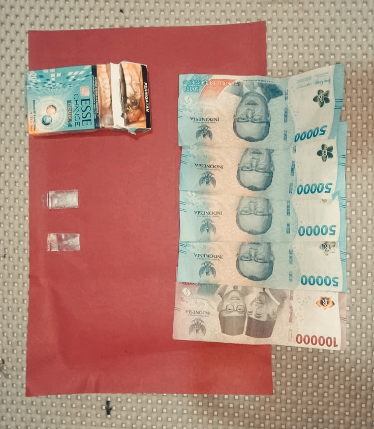 Dari tangan tersangka, petugas menemukan sejumlah barang bukti yang menguatkan dugaan keterlibatannya dalam peredaran narkotika. Barang bukti tersebut berupa dua paket kecil diduga narkotika jenis sabu dengan berat kotor total sekitar 0,45 gram, yang diduga siap edar. Selain itu, turut diamankan uang tunai sebesar Rp300.000 yang diduga hasil transaksi narkotika, serta satu unit handphone android merk Vivo warna hitam yang digunakan sebagai sarana komunikasi dalam aktivitas ilegal tersebut.