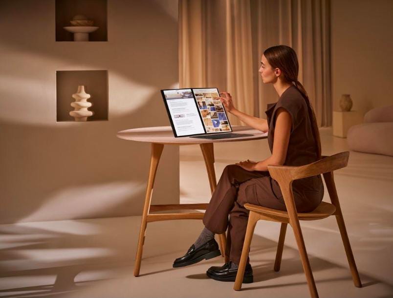 Zenbook DUO (UX8406) dibekali dengan dua layar 14-inci beresolusi 3K 120Hz dan berteknologi ASUS Lumina OLED. Ketika dibentangkan, ukuran layarnya setara dengan 19,8-inci sehingga penggunanya memiliki ruang kerja yang lebih luas dibandingkan dengan laptop standar yang berarti produktivitas dapat didongkrak hingga dua kali lipat.