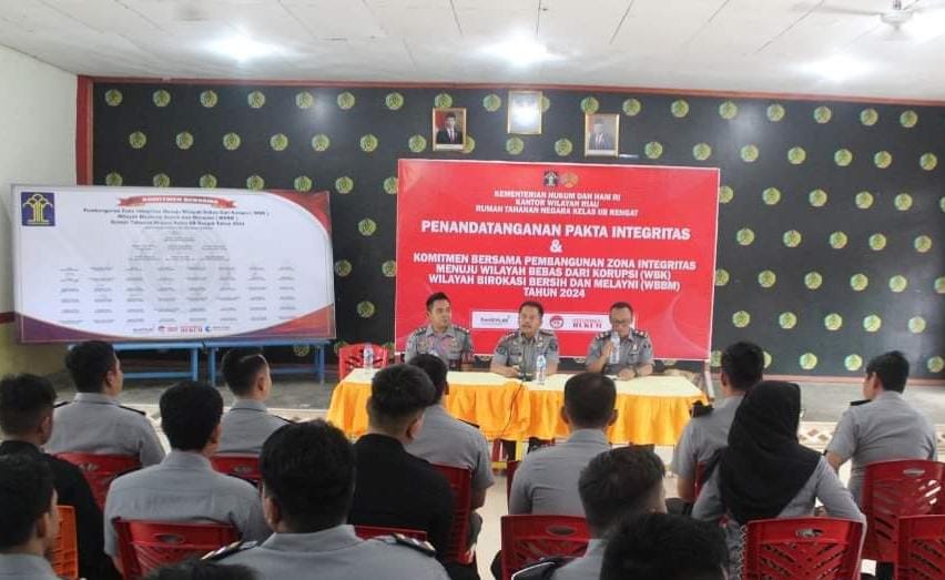 TRANSMEDIARIAU.COM, INHU - Rumah Tahanan Negara (Rutan) Kelas IIB Rengat Kanwil Kemenkumham Riau melaksanakan apel penandatanganan Pakta Integritas dan Komitmen Bersama dalam membangun Zona Integritas (ZI) menuju Wilayah Bebas dari Korupsi (WBK) dan Wilayah Birokrasi Bersih dan Melayani (WBBM).